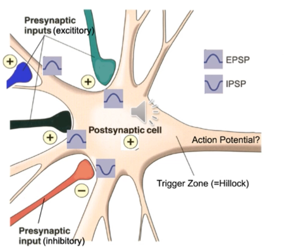 Cellen mottar hela ständigt flera signaler och beslut om vidarebefordring tas alltså i axon hillock (är den tillräckligt depolariserad!?)