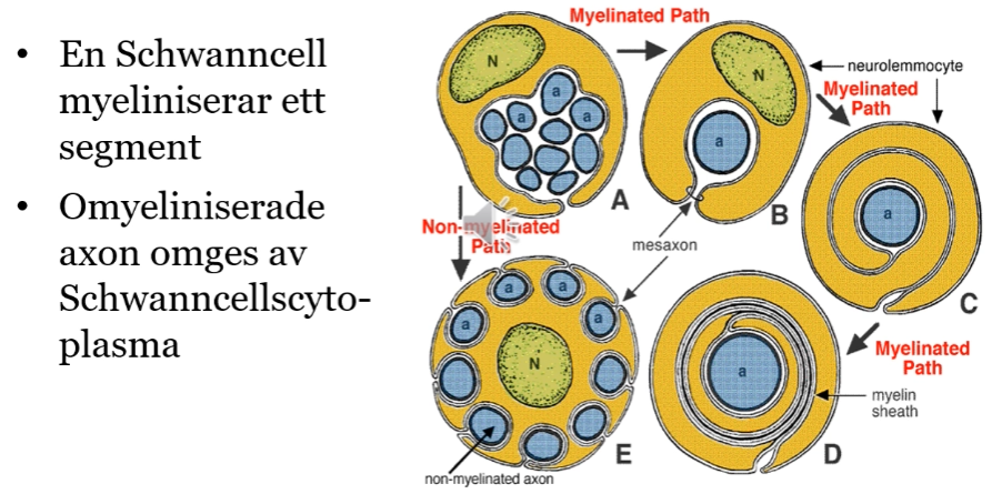 Hur sker myelinisering i PNS och vad omger icke myeliniserade axoner?
