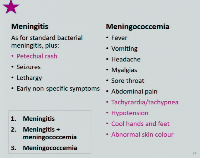 list the unique symptoms of Meningococcemia