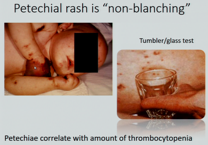 petechial rashes are non-blanching and correlates with amount of thrombocytopenia
