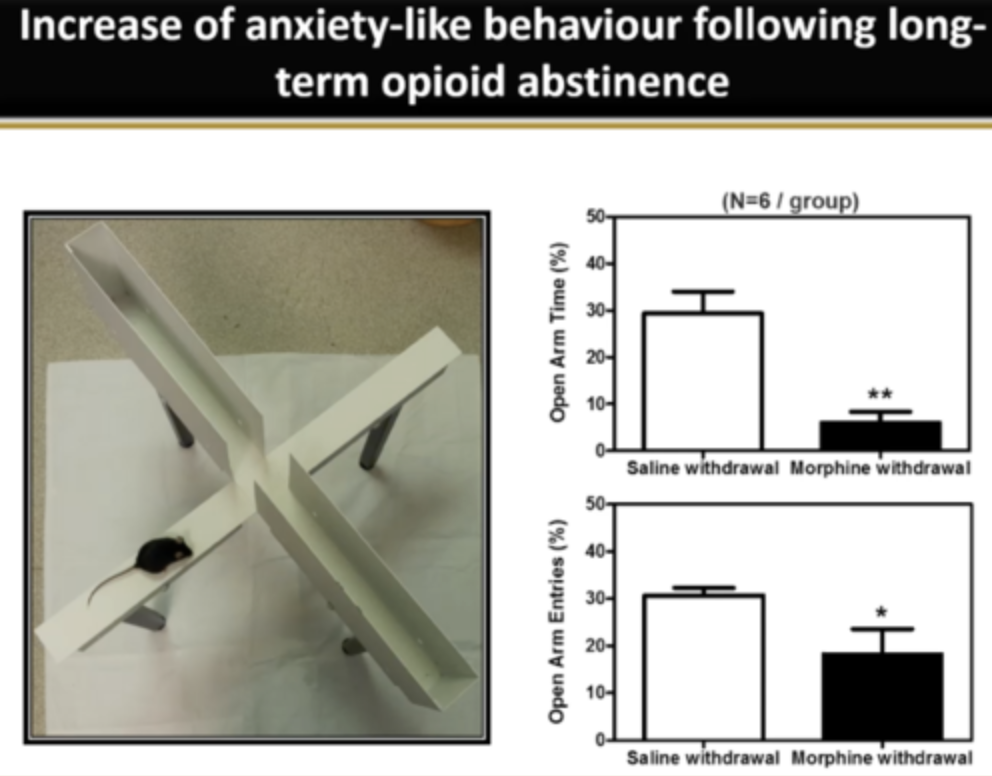Morphine withdrawn animals spent significantly less time and entries in the open arms compared to saline withdrawn animals.