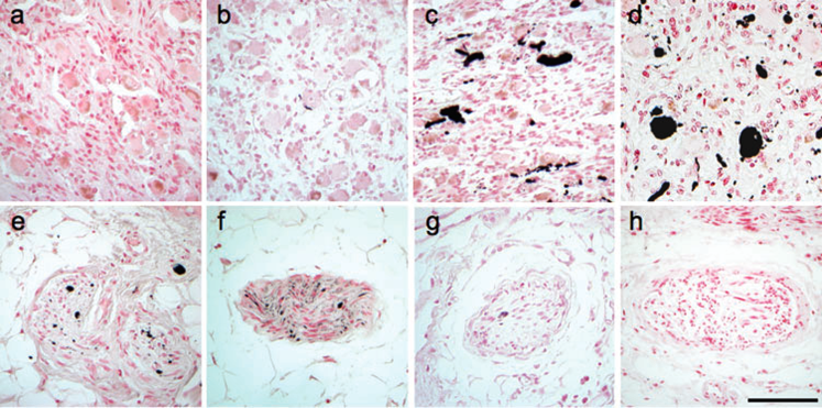 α-Syn pathology in the epicardial nerve fascicles (e, f) and paravertebral sympathetic ganglia (a, b).