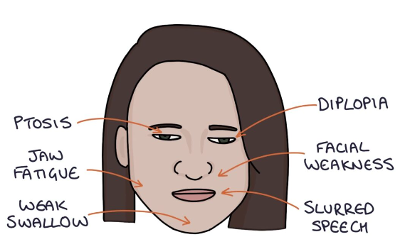 The critical feature is weakness that worsens with muscle use and improves with rest. Symptoms are typically best in the morning and worst at the end of the day.