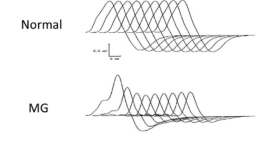 - A decline in the amplitude of CMAPs after repetitive nerve stimulation, known as decrement, supports the diagnosis of MG.