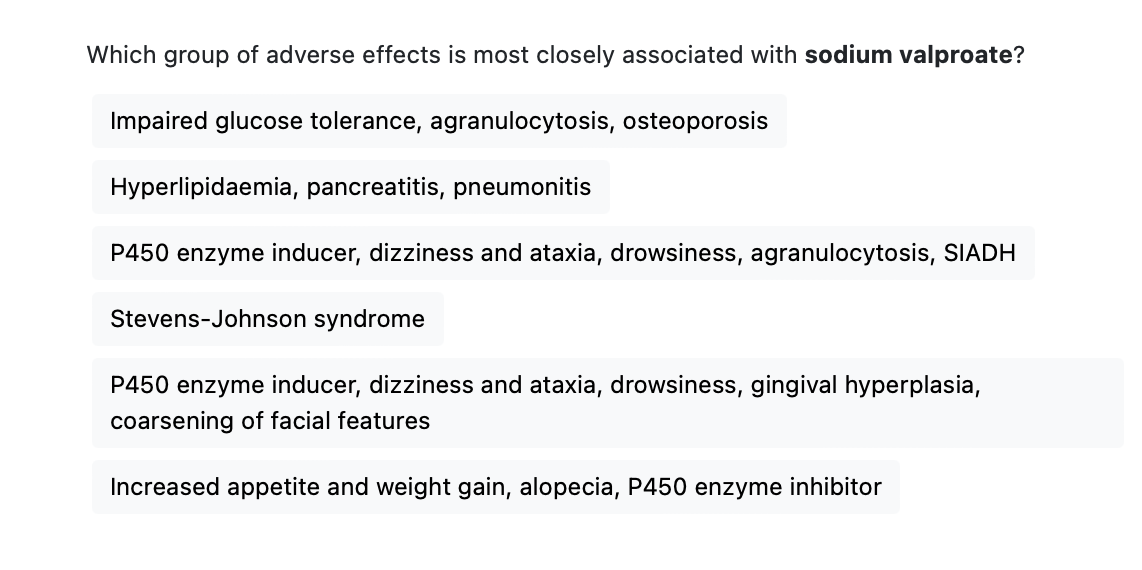 P450 enzyme inducer, dizziness and ataxia, drowsiness, agranulocytosis, SIADH