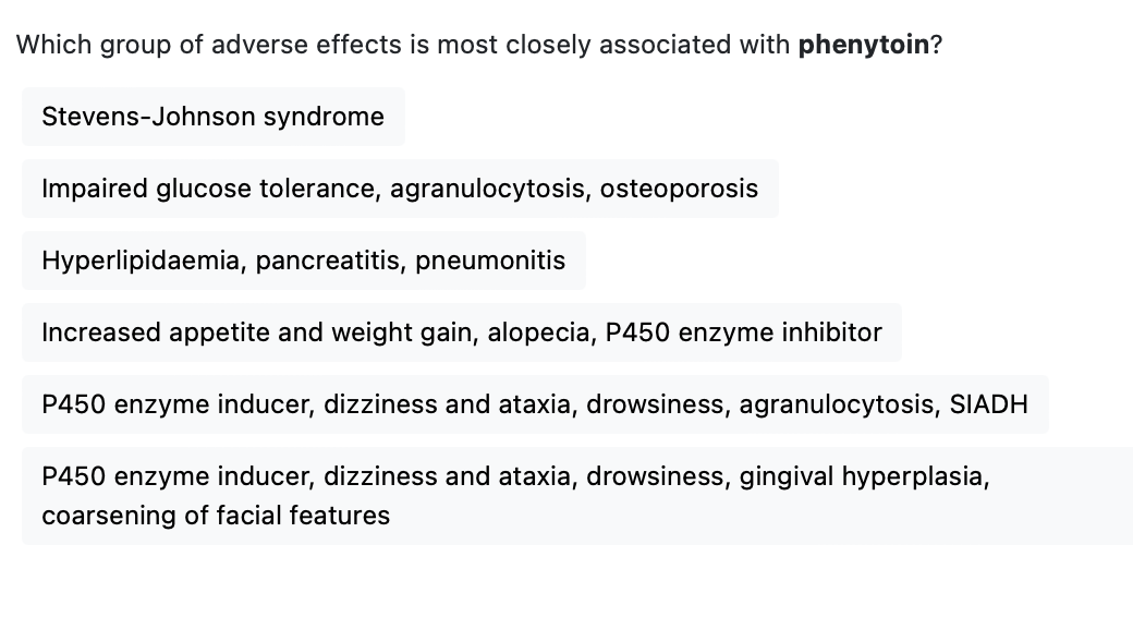 P450 enzyme inducer, dizziness and ataxia, drowsiness, gingival hyperplasia, coarsening of facial features