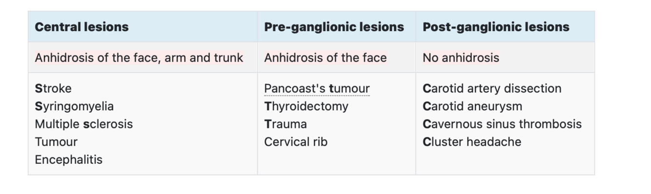With Horners, anhydrosis determines the site of the lesion. The causes can be remembered as the 4 Ss, 4 Ts and 4 Cs.