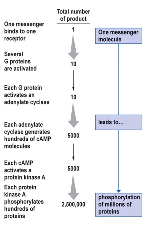 GPRC: secondary messengers amplify signals to downstream target molecules - can need just one ligand binding to one GPCR