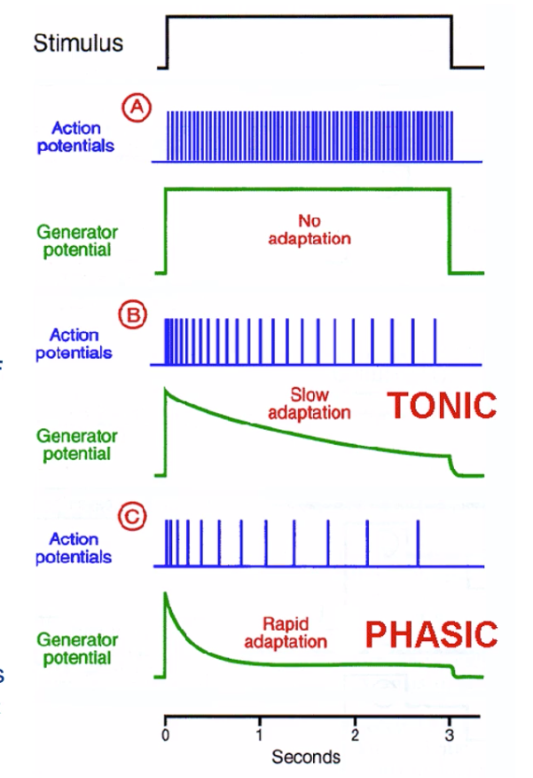 rapidly adapting: Meissner corpuscles (light touch), Pacinian corpsucles (vibration)