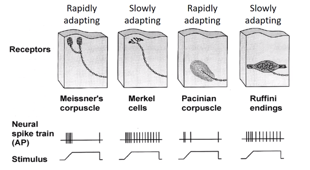 slowly adapting: Merkel cells (pressure, texture), Ruffini endings (stretching of skin)