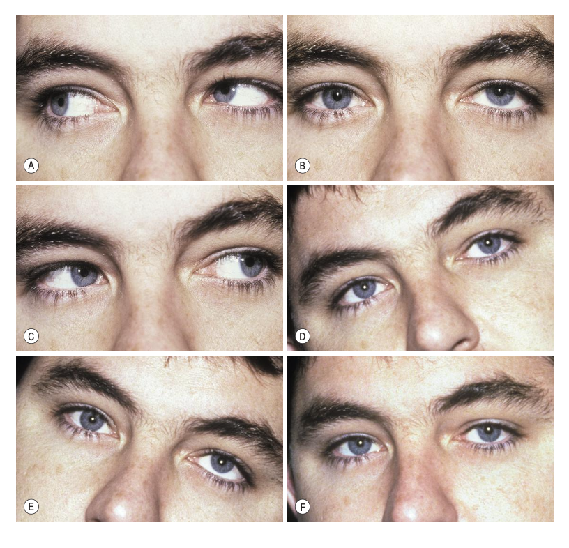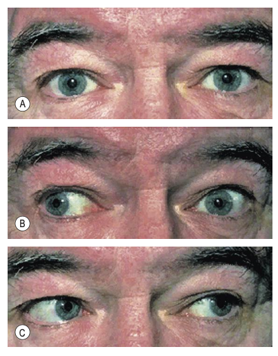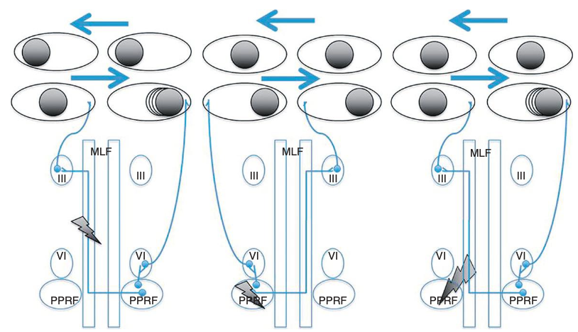 Gaze is a complex eye movement that is mainly controlled by the combination of CNs III, IV, and VI. Gaze can be simply classified as lateral, vertical, or conjugate. The frontal eye field (Area 8) and supplementary eye field (Area 6) are regions of the cerebral cortex that control gaze, and they innervate the contralateral paramedian pontine reticular formation (PPRF). Fibers from the PPRF reach the ipsilateral CN VI nucleus and contralateral CN III nucleus through the contra- lateral MLF to control lateral gaze. Lateral gaze palsies are classified as internuclear ophthalmo- plegia (INO), lateral gaze palsy, or one-and-a- half syndrome, and the corresponding lesions are located in the MLF, PPRF, and both MLF and PPRF, respectively. In INO, lesions in the
