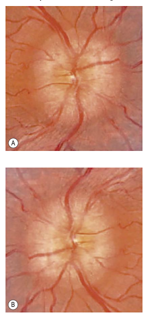 This is the commonest cause of acute visual loss in older patients, and thought to be due to ischemia in posterior circulation of the gobe—predomi- nantly vessels supplying the optic nerve at its exit from the eye. It is classified as non-arteritic or arteri- tic, the former being much more common. In all cases of AION, it is vital to determine whether there is any evidence of an arteritic cause (e.g., giant cell arteritis). Untreated giant cell arteritis can cause rapid, sequential, or simultaneous blindness in both eyes. If giant cell arteritis is suspected because of an elevated ESR or CRP, or both, or because of symptoms such as headache, scalp and temple tenderness, myalgias, arthralgias, low-grade fever, anemia, malaise, weight loss, anorexia, or jaw clau- dication, oral or intravenous steroid treatment should be instituted immediately. In acute cases, the patient may benefit from high-dose intravenous steroids. Biopsy of the temporal artery should follow within days of steroid therapy. In arteritic AION, the visual loss is usually profound, and the optic nerve is often diffusely swollen and pale.
