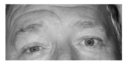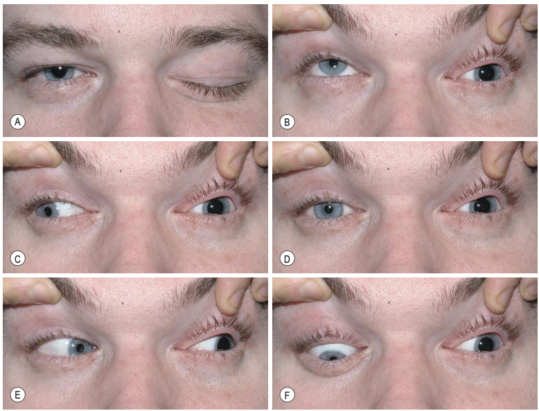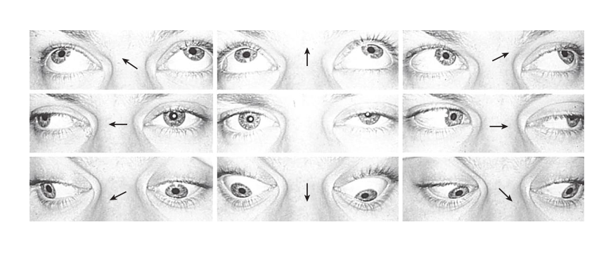 A 17-year-old presents after a head injury with diplopia, particularly worse when walk- ing down stairs and two images are oblique to each other. Examination findings are shown