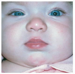 A 5-year-old child presents with diplopia and numbness over right forehead. Examination findings shown in primary gaze, down gaze, left gaze and right gaze. Which one of the following are most likely?