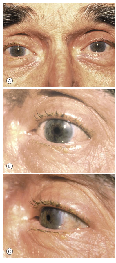 Dorsal midbrain syndrome (Parinaud’s syndrome) consists of upgaze palsy, convergence spasm or paresis, bilateral mid-dilated pupils with light- near dissociation (poor reaction to light and good reaction to near), and convergence-retraction nystagmus. The nystagmus is unique to this syn- drome and consists of rapid convergence with retraction of the globes on attempted upgaze. Common causes include pinealomas, aneurysms of the vein of Galen, and noncommunicating hydrocephalus with distention of the third ventri- cle and the anterior aqueduct of Sylvius. This syn- drome may also occur with stroke as one of the “top of the basilar” syndromes.
