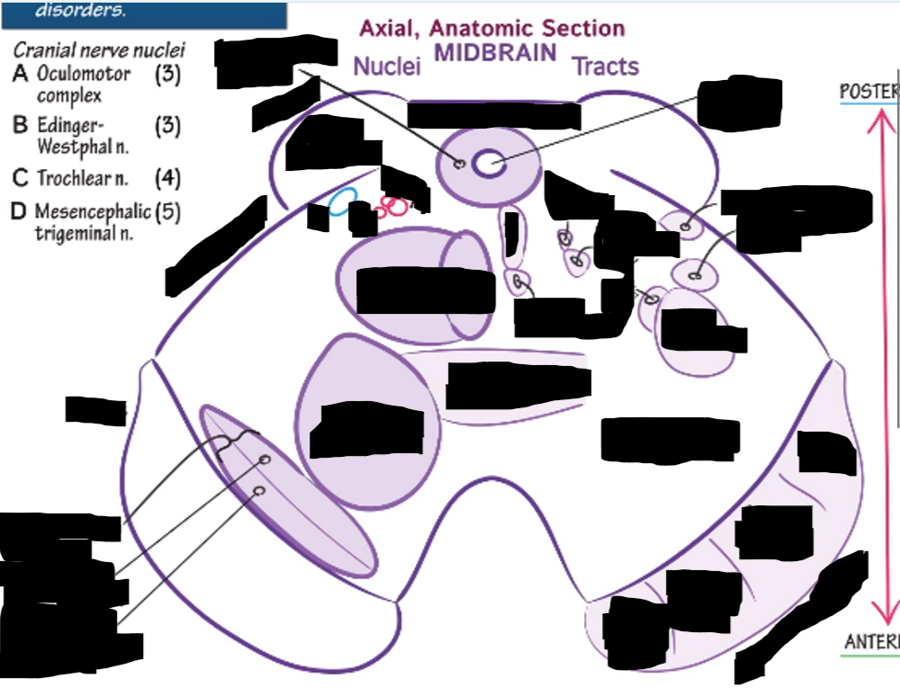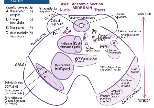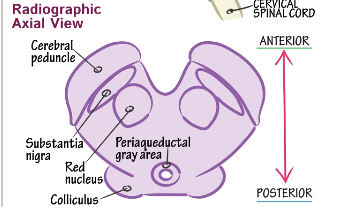 The center of the crus divides into the corticonuclear tracts (aka corticobulbar tracts), medially, and the corticospinal tracts, laterally.