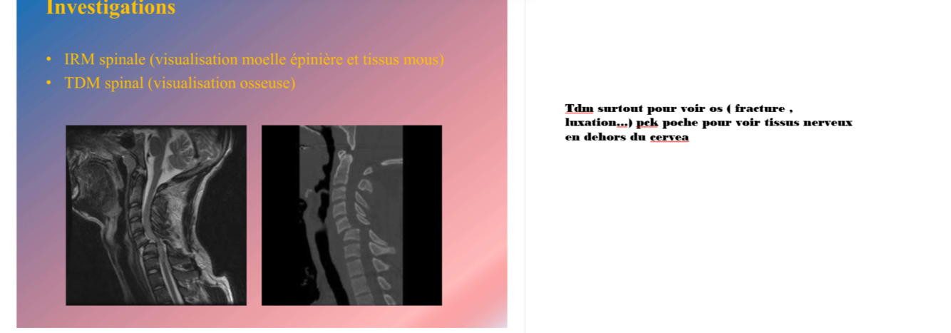TDM ( plus pour os, poche pour tissu nerveux en dehors du cerveau) et IRM ++