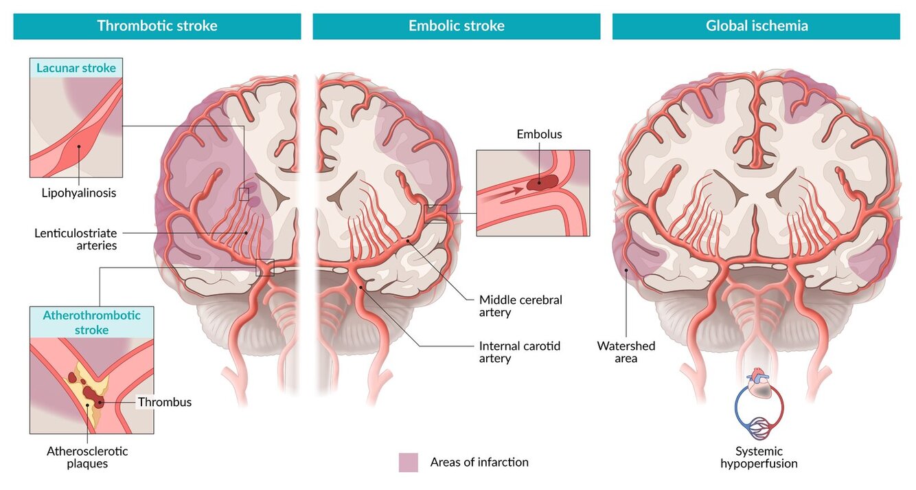 A interrupção de sangue leva a uma falha na bomba K-Na ATP dependente, promovendo alterações citotóxicas com liberação de glutamato e influxo de cálcio, levando a um influxod e água por osmose e consequente edema citotóxico