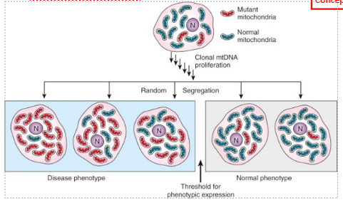 Mitochondria undergo fission to replicate. During this process, their DNA is segregated randomly into daughter organelles, so there is a high degree of random inheritance of mtDNA during mitochondrial replication. As such, a single mutation in mtDNA can result in a wide array of phenotypic expression depending on how much of the mutated DNA is present in their mitochondria. This is described as homoplasmy (all mitochondria have identical genomes) vs. heteroplasmy (there is a mix of DNA populations within one cell’s mitochondria). As such, there is a gradient of phenotypic expression.