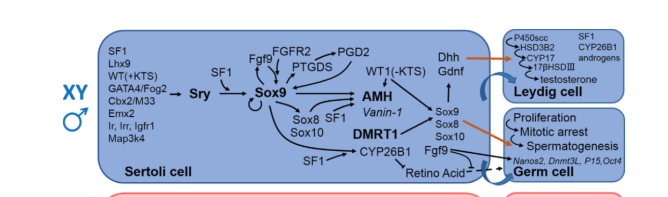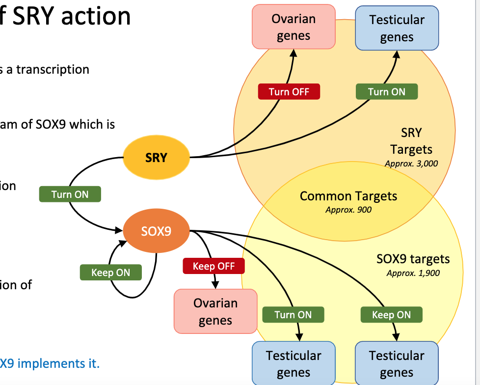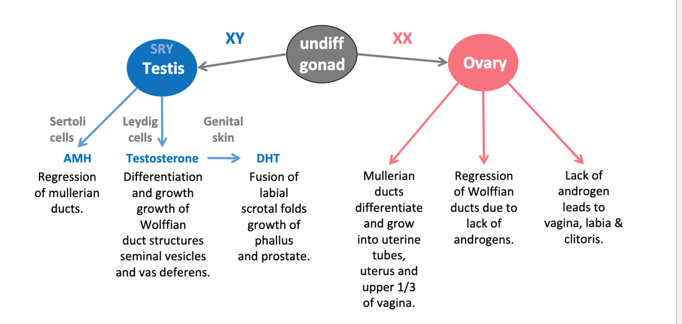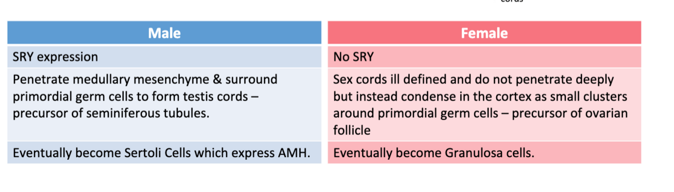 -males = SRY expressed, develop testis cords and seminiferous vesicles and Sertoli cells