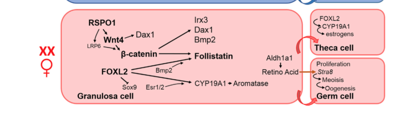 - females = no SRY expressed, no deep penetration of sex cords, follicle formed and granulosa cells