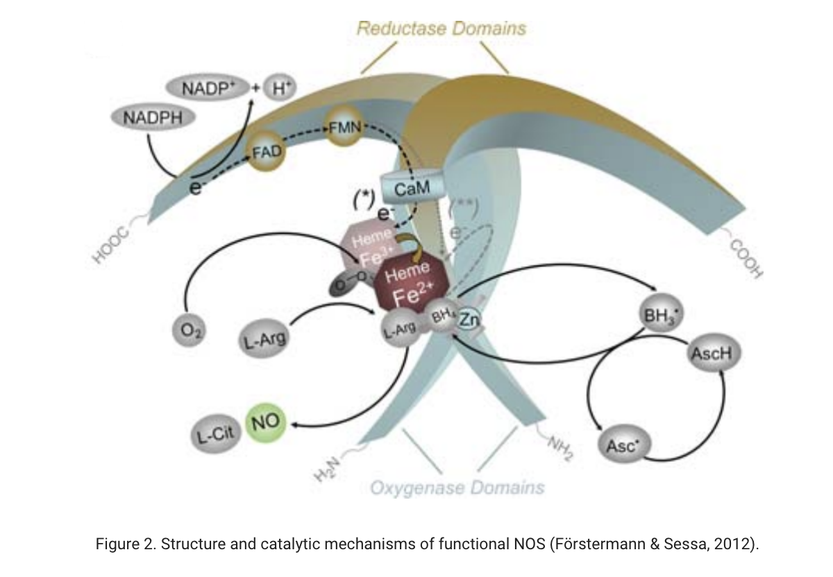 When sufficient L-ARG and BH4 are present, Intact NOS dimers couple their haem and O2 reduction to the synthesis of NO