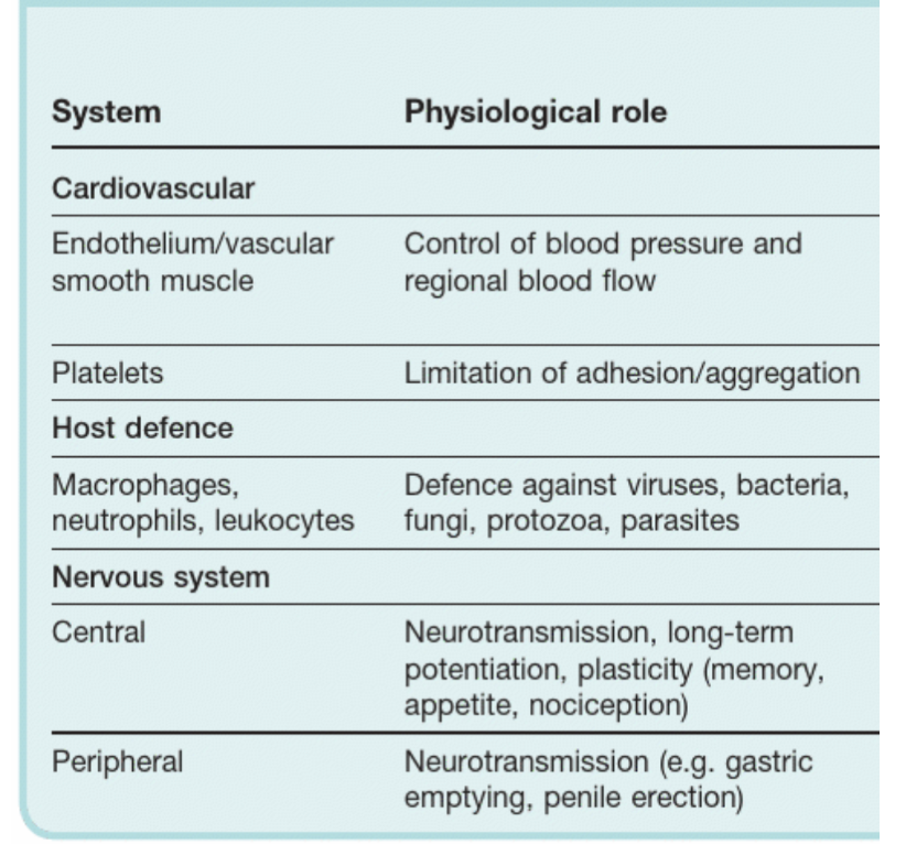 1-Neuronal: Constitutive form found in neurones 2-inducible: Found in macrophages/ kupffer cells/fibroplasts/vascular smooth muscle/endothelium. Upregulated by pathological stimuli 3. Endothelial; constitutive form. Also present in cardiomyocytes/renal mesangial cells/ osteoblasks/ platelets