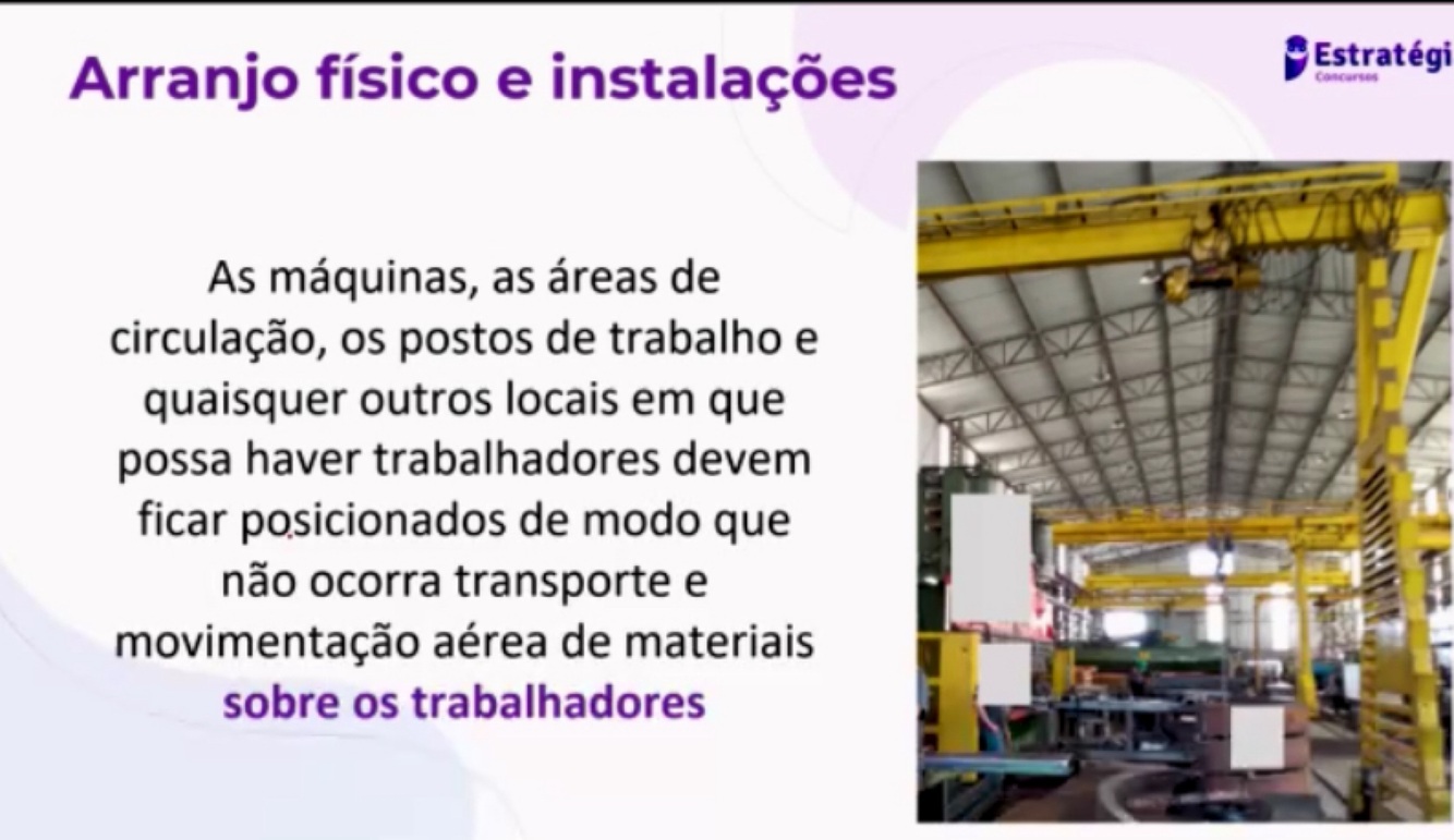 As máquinas, as áreas de circulação, os postos de trabalho e quaisquer outros locais em que possa haver trabalhadores devem ficar posicionados de modo que facilite o transporte e movimentação aérea de materiais sobre os trabalhadores.