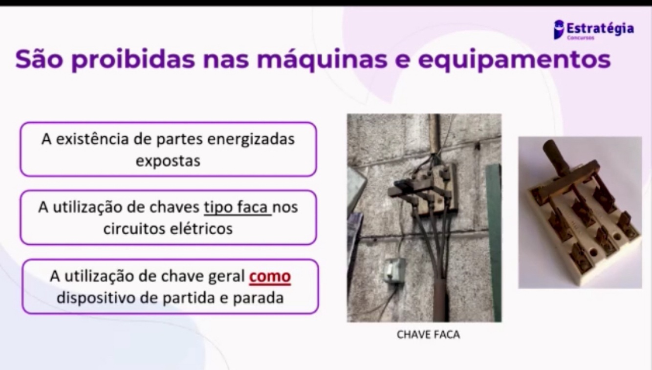 Os circuitos elétricos de comando e potência das máquinas e equipamentos devem ser projetados e mantidos de modo a prevenir, por meios seguros, os perigos de choque elétrico, incêndio, explosão e outros tipos de acidentes, conforme previsto nas normas técnicas oficiais e, na falta dessas, nas normas internas da empresa .