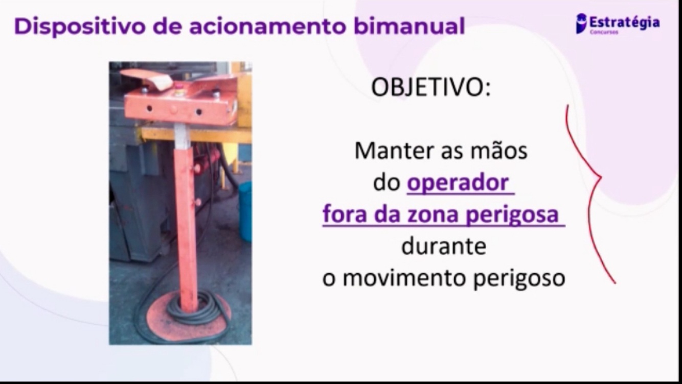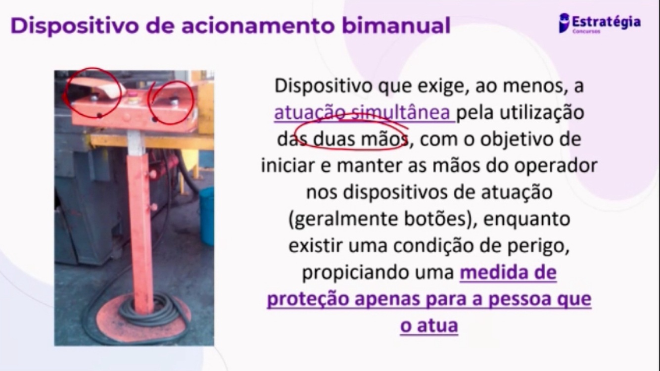 Quando forem utilizados dispositivos de acionamento bimanual, visando a manter as mãos do operador fora da zona de perigo, esses devem atender aos seguintes requisitos mínimos do comando:(7)
