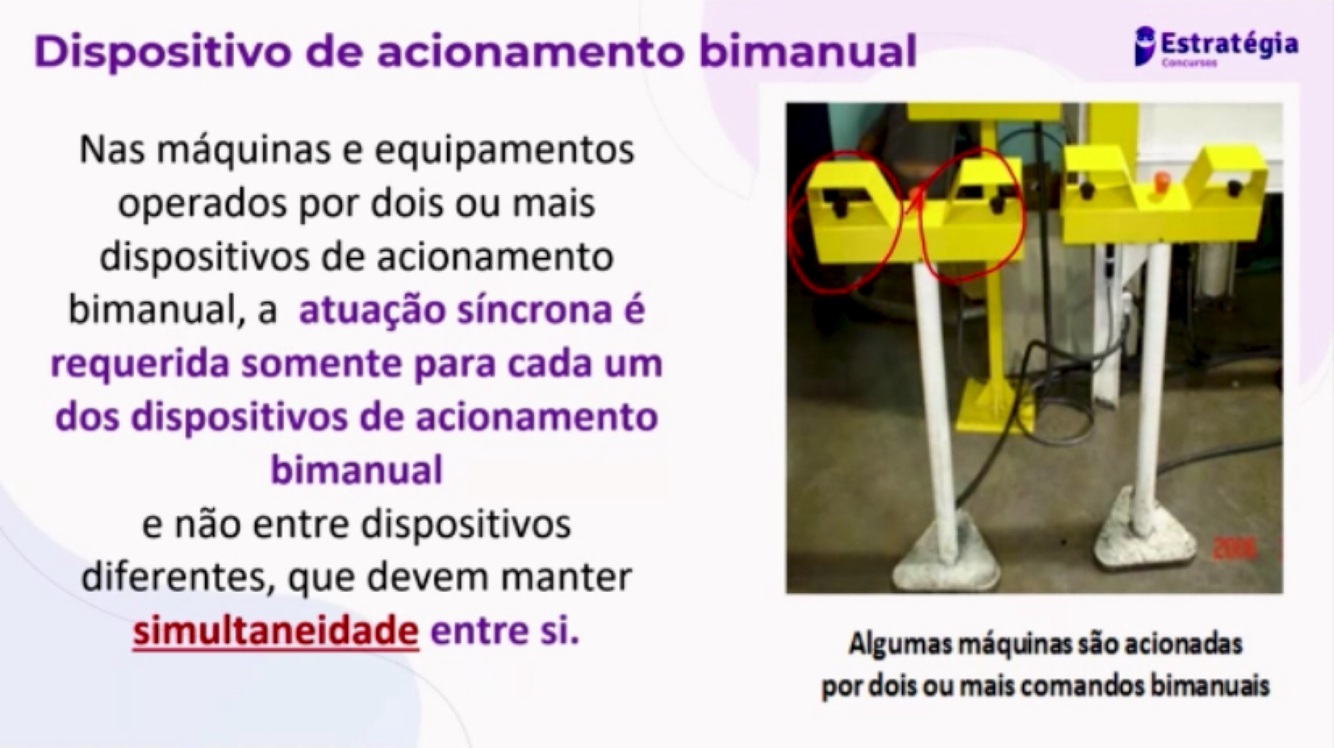 Nas máquinas e equipamentos operados por dois ou mais dispositivos de acionamento bimanual, a atuação síncrona é requerida somente para dispositivos diferentes ,que não devem manter simultaneidade entre si .