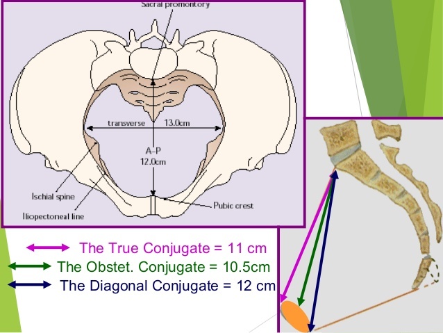 shortest distance between promontory of sacrum and symphysis pubis ~10.5 cm