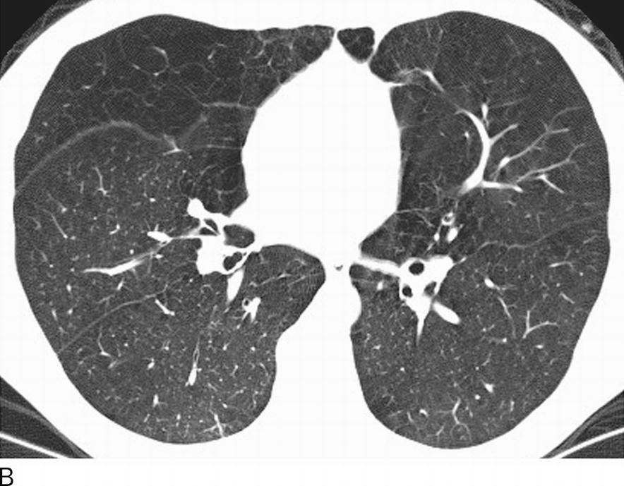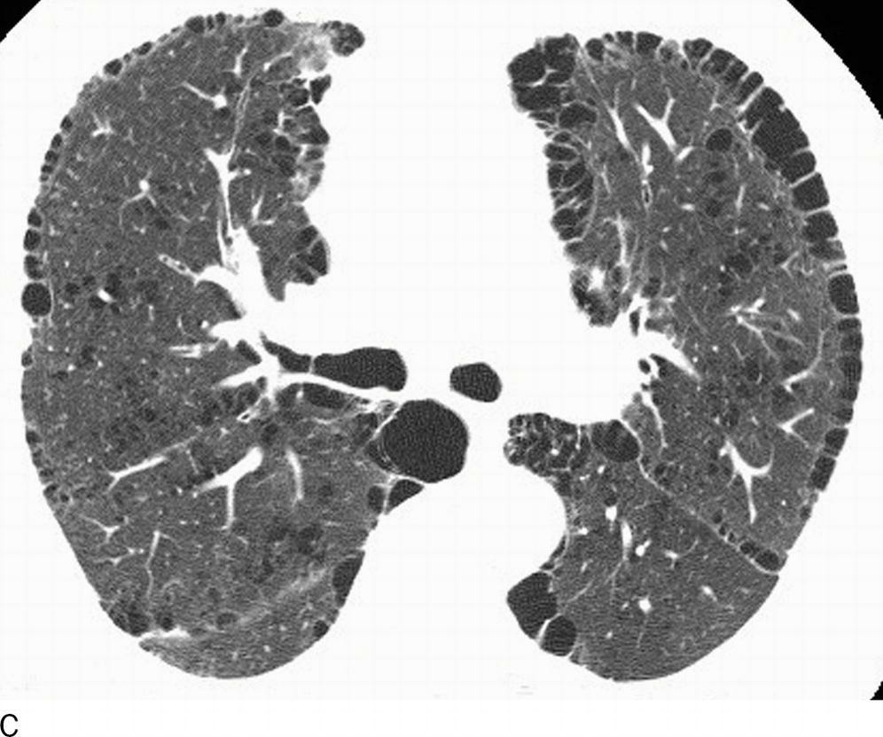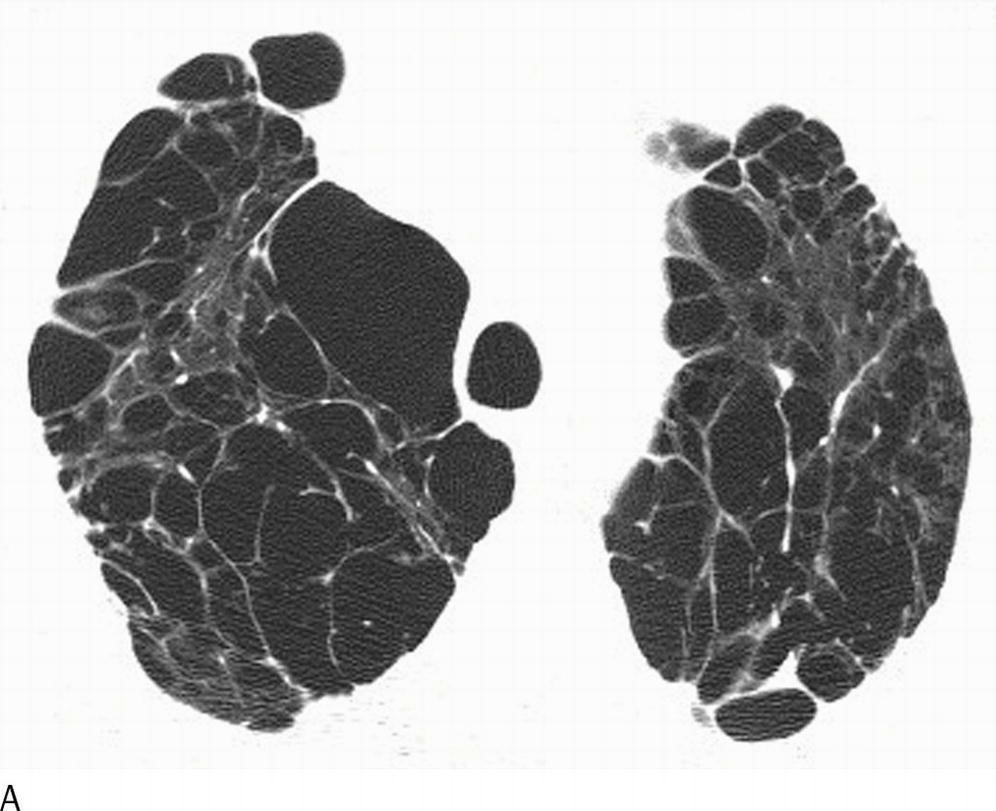 Panlobular emphysema with extensive involvement of the lower lobes, often in young adults