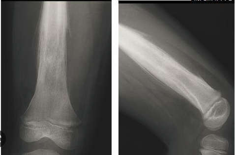 - Most commonly long bone metaphyses (distal femur/prox humerus, tibia, pelvis and skull)