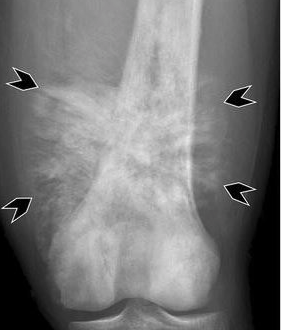 XR: dense sclerosis at metaphysis with soft tissue expansion- ‘sunburst appearence’