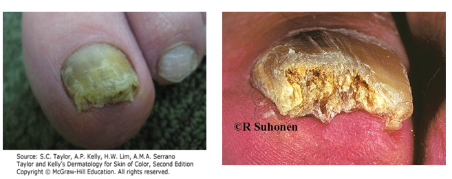(1) Nail discoloration, subungual hyperkeratosis, onycholysis, splitting of the nail plate, and nail plate destruction