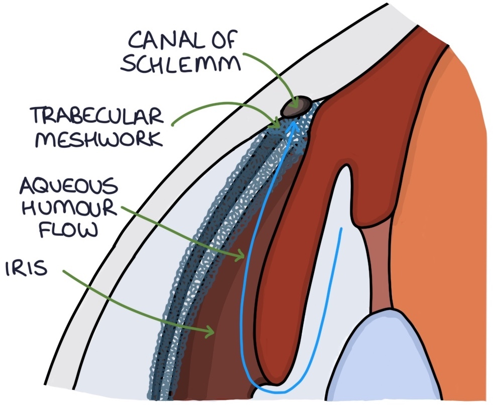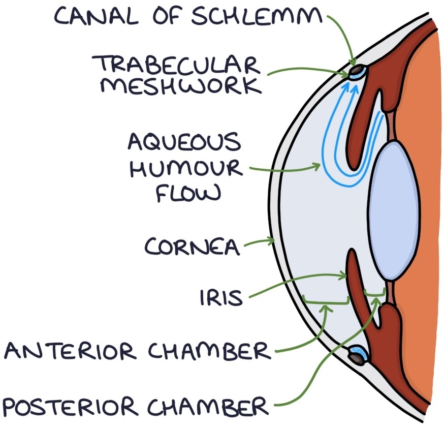 The aqueous humour is produced by the ciliary body. The aqueous humour flows from the ciliary body, around the lens and under the iris, through the anterior chamber, through the trabecular meshwork and into the canal of Schlemm. From the canal of Schlemm it eventually enters the general circulation.