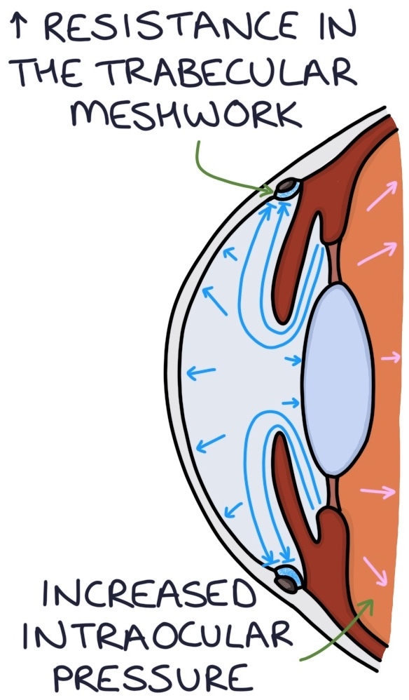 In open-angle glaucoma, there is a gradual increase in resistance through the trabecular meshwork. This makes it more difficult for aqueous humour to flow through the meshwork and exit the eye. Therefore the pressure slowly builds within the eye and this gives a slow and chronic onset of glaucoma.