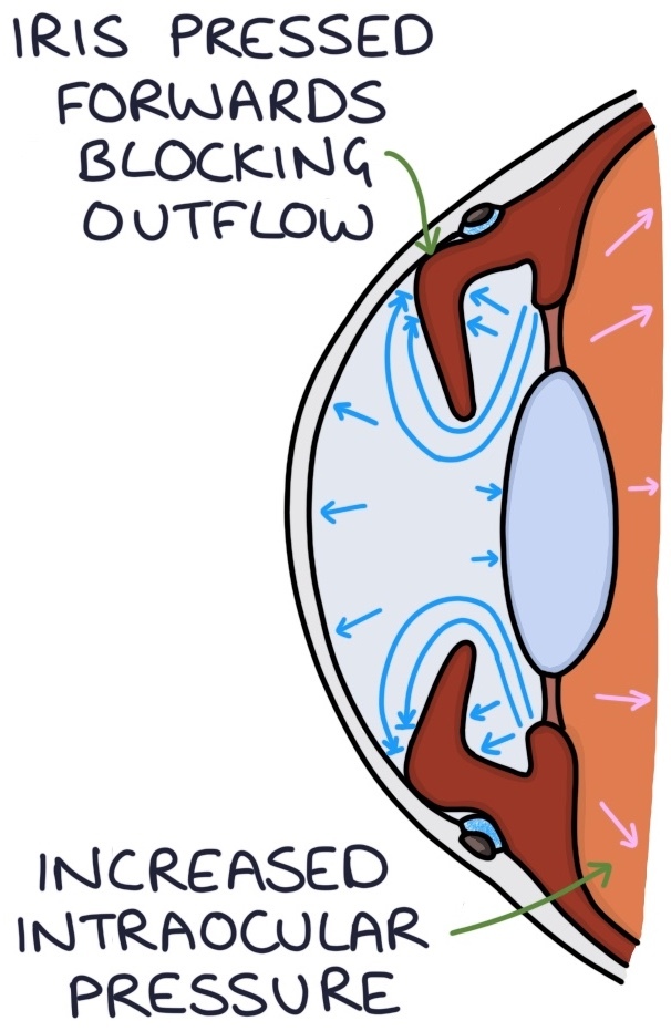 In acute angle-closure glaucoma, the iris bulges forward and seals off the trabecular meshwork from the anterior chamber preventing aqueous humour from being able to drain away. This leads to a continual build-up of pressure. This is an ophthalmology emergency.