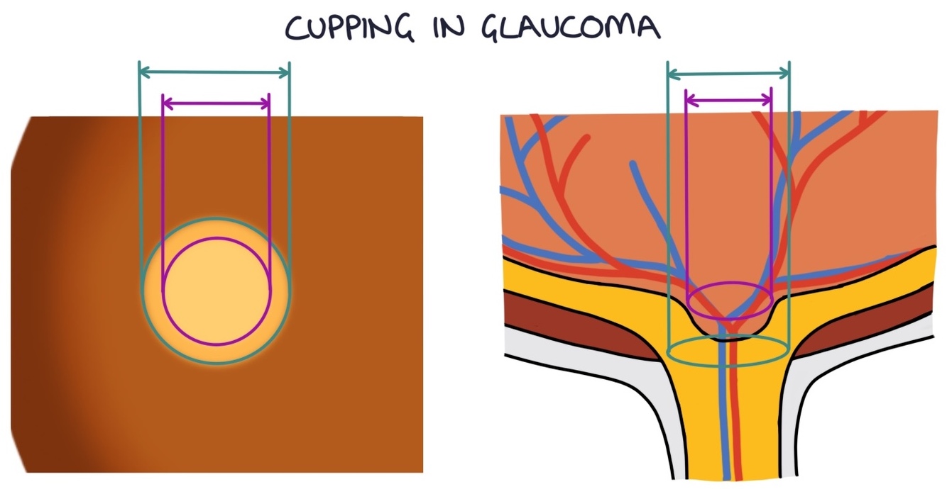 Increased pressure in the eye causes cupping of the optic disc. In the centre of a normal optic disc is the optic cup. This is a small indent in the optic disc. It is usually less than half the size of the optic disc. When there is raised intraocular pressure, this indent becomes larger as the pressure in the eye puts pressure on that indent making it wider and deeper. This is called “cupping”. An optic cup greater than 0.5 the size of the optic disc is abnormal.