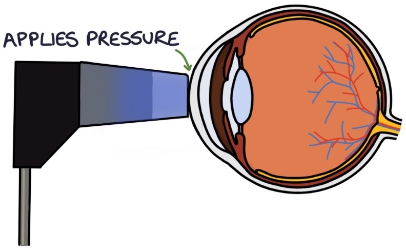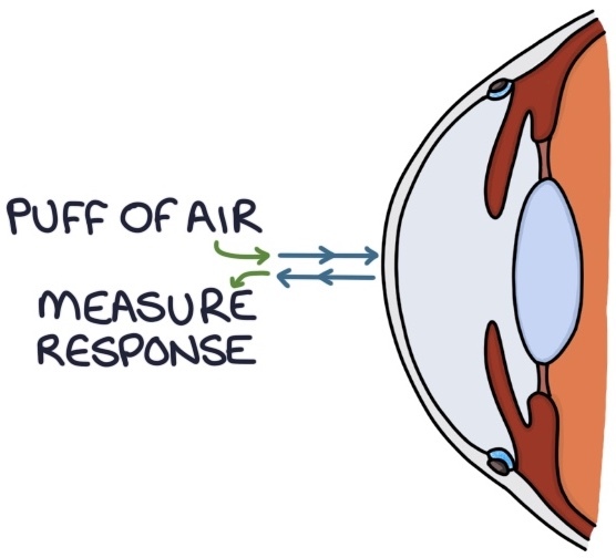 Non-contact tonometry is the commonly used machine for estimating intraocular pressure by opticians. It involves shooting a “puff of air” at the cornea and measuring the corneal response to that air. It is less accurate but gives a helpful estimate for general screening purposes.
