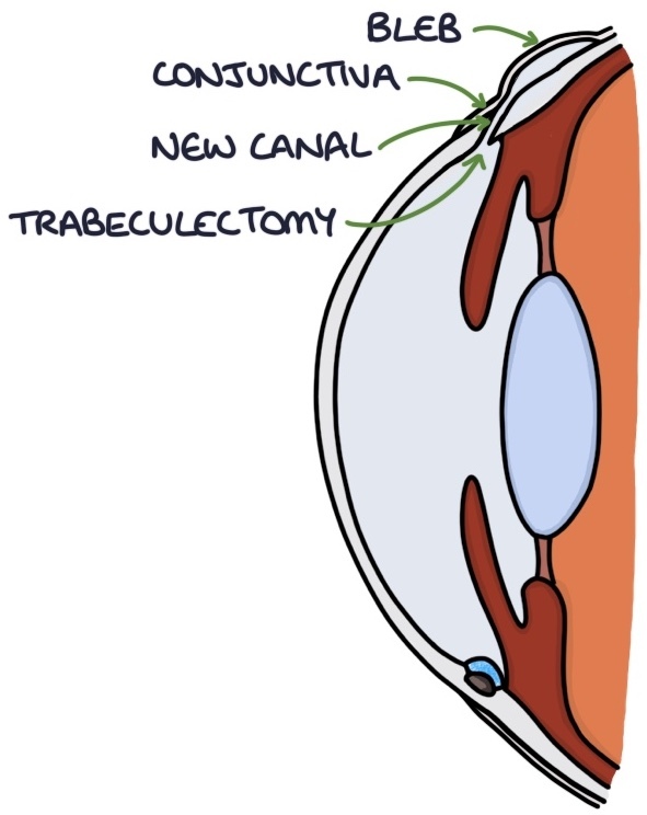 Trabeculectomy surgery may be required where eye drops are ineffective. This involves creating a new channel from the anterior chamber, through the sclera to a location under the conjunctiva. It causes a “bleb” under the conjunctiva where the aqueous humour drains. It is then reabsorbed from this bleb into the general circulation.