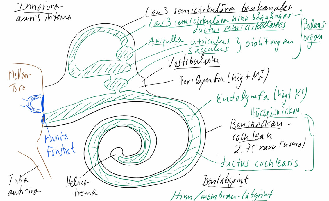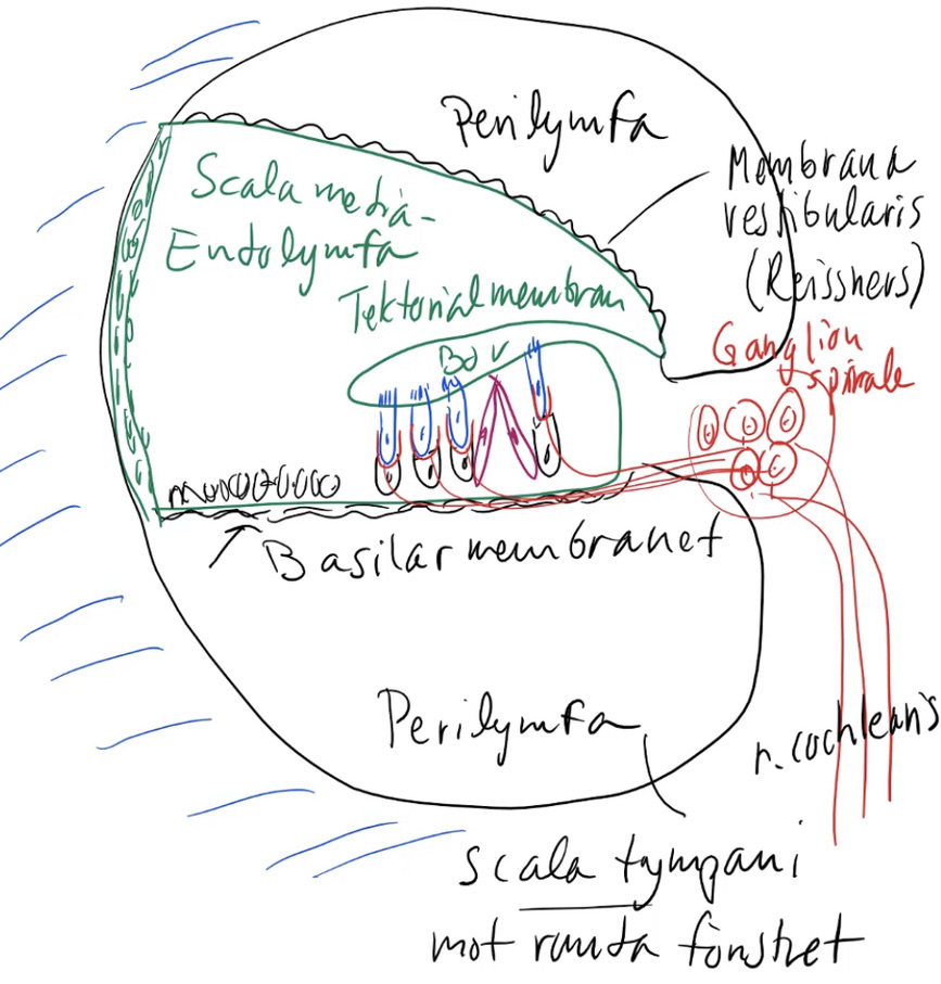 Bensnäckan — cochlean (2,75 varv på människan) — vätskefyllt med endolymfa som har högt K+ — perilymfa har normalt högt natrium