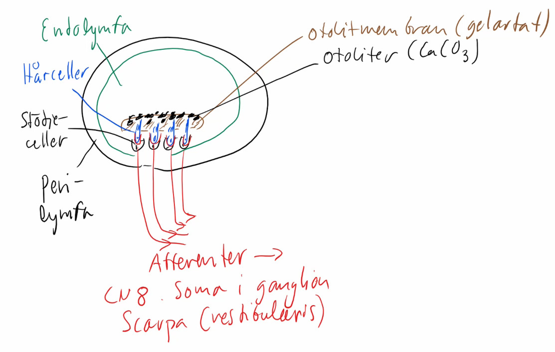 Vid linjär acceleration → böjning av cilier via tröga otolitmembranet → aktivering av sensoriska afferenter på samma sätt som ampullan via mekanoelektriska kaliumkanalerna