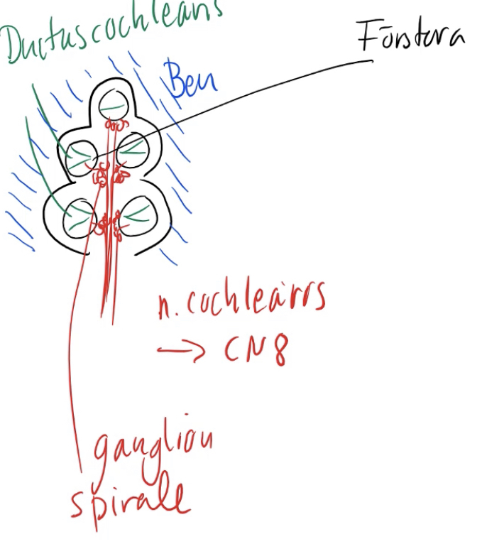 Nerven kan ses i mitten och ansluter sig i CN8 — ganglion spirale
