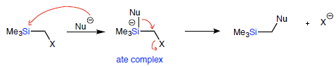 SN2 or via a silicon-ate intermediate (5-coordinate intermediate with -ve charge)