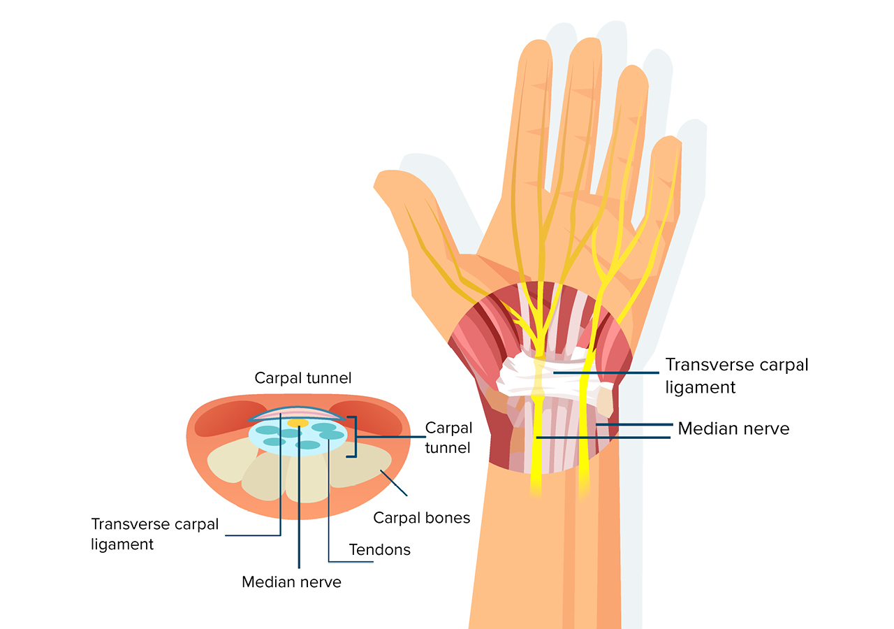 Under which structure is the nerve trapped in carpal tunnel syndrome