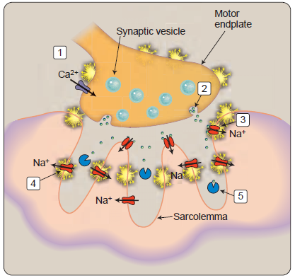 4) Se abren los canales de sodio dependientes del voltaje y se propaga un potencial de acción a lo largo del sarcolema.