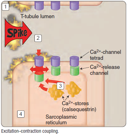 3) En el retículo sarcoplásmico el Ca²+ sale en gran cantidad de las reservas hacia el sarcoplasma.