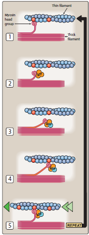 5) La cabeza de miosina se reposiciona y desplaza el filamento fino. Luego, el ciclo se repite.